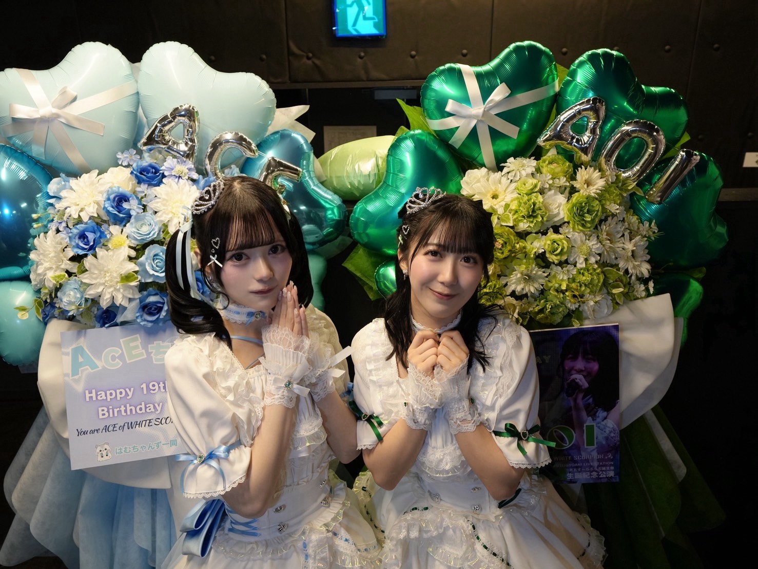 2人のお揃いのプリキュアのような可愛い衣装も最高だったし、それを表すかのようなライトブルーとグリーンのサイリウムの明かりが凄い綺麗だったし、夢の中にいるような感じでした。いつも仕事や生活していく中で色々くじけそうな時があっても、ACEをはじめホワスピのみんなの頑張りや、笑顔から勇気をもらってるからネ👍