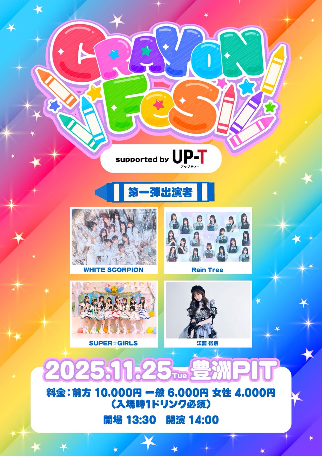 2025.10.21 11月25日(火)「CRAYON Fes supported by UP-T」出演決定! LIVE / EVENT 11月25日(火)開催「CRAYON Fes supported by UP-T」にWHITE SCORPION の出演が決定しました!詳細は追ってお知らせいたします。 日程:2025年11月25日(火)会場:豊洲PIT開場:13:00開演:13:30※変更の可能性がございます。 料金:前方 10,000円 /一般 5,000円/女性 2,000円(入場時1ドリンク必須) BACK INDEX NEXT