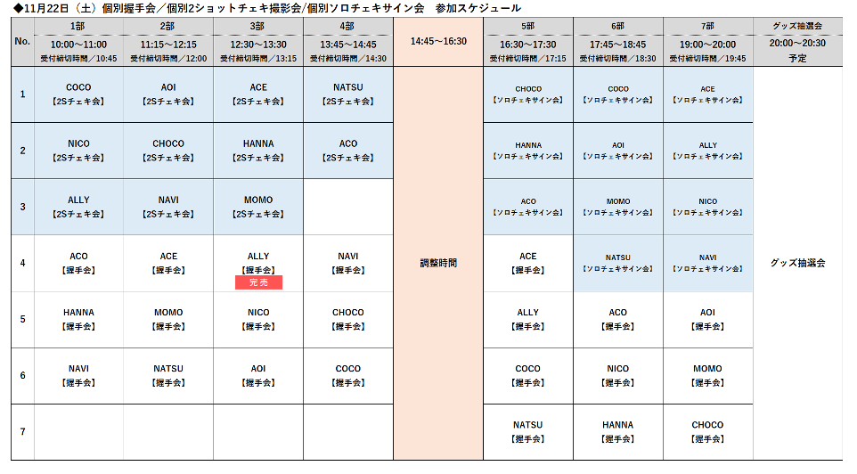 ・抽選会は握手会/2ショットチェキ撮影会/個別ソロチェキサイン会の全工程終了後に実施いたします。実施時間は20:00~20:30(抽選締切20:00)を予定しております。