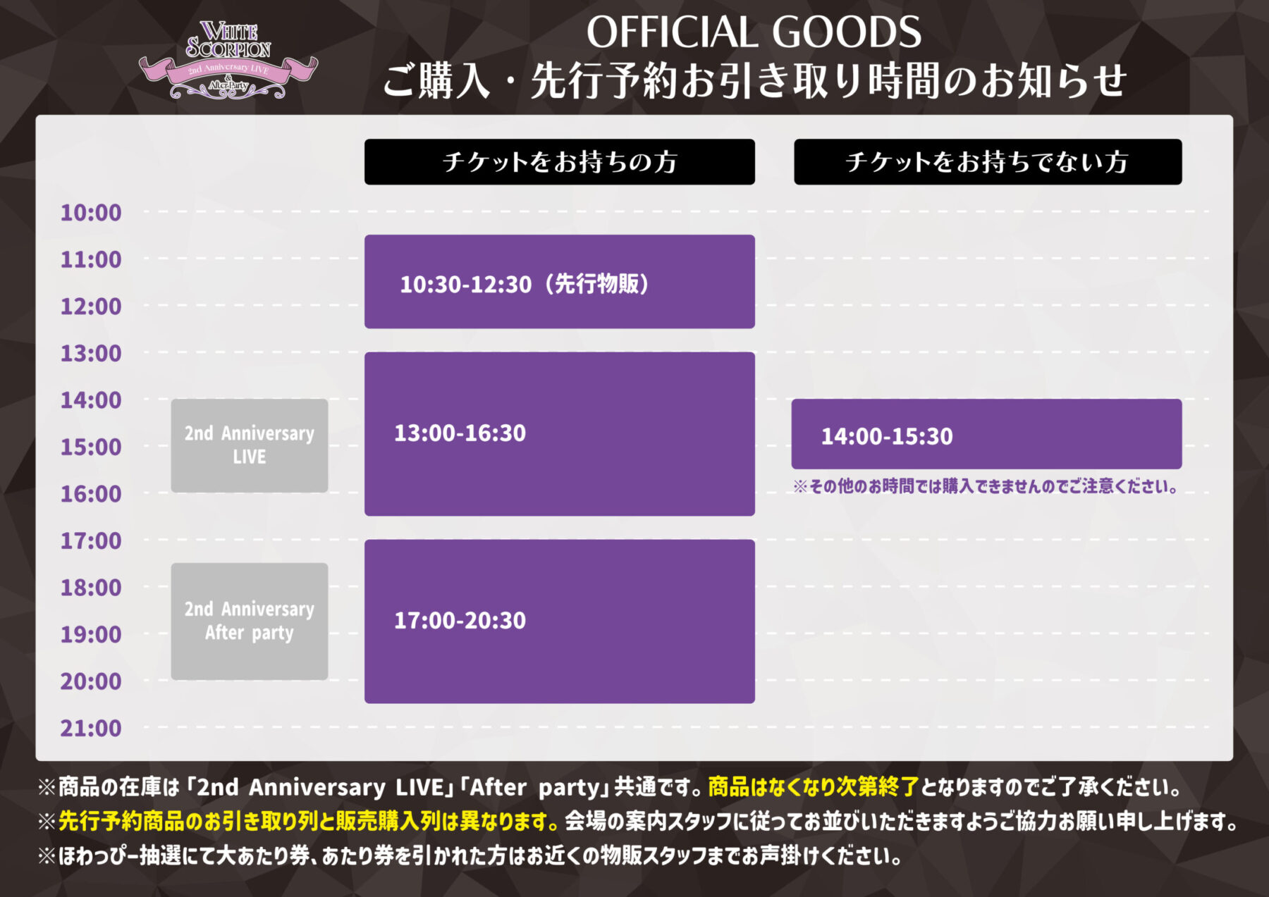 「WHITE SCORPION 2nd Anniversary LIVE」&「2nd Anniversary LIVE After Party」グッズ販売時間・会場限定グッズ購入特典決定!