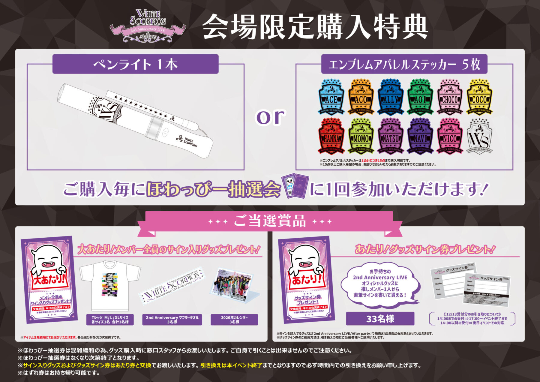 2025年12月13日(土)に行われる「WHITE SCORPION 2nd Anniversary LIVE」&「2nd Anniversary LIVE After Party」のライブ会場(品川ステラボール)にて、OFFICIAL GOODSの販売が決定しました!