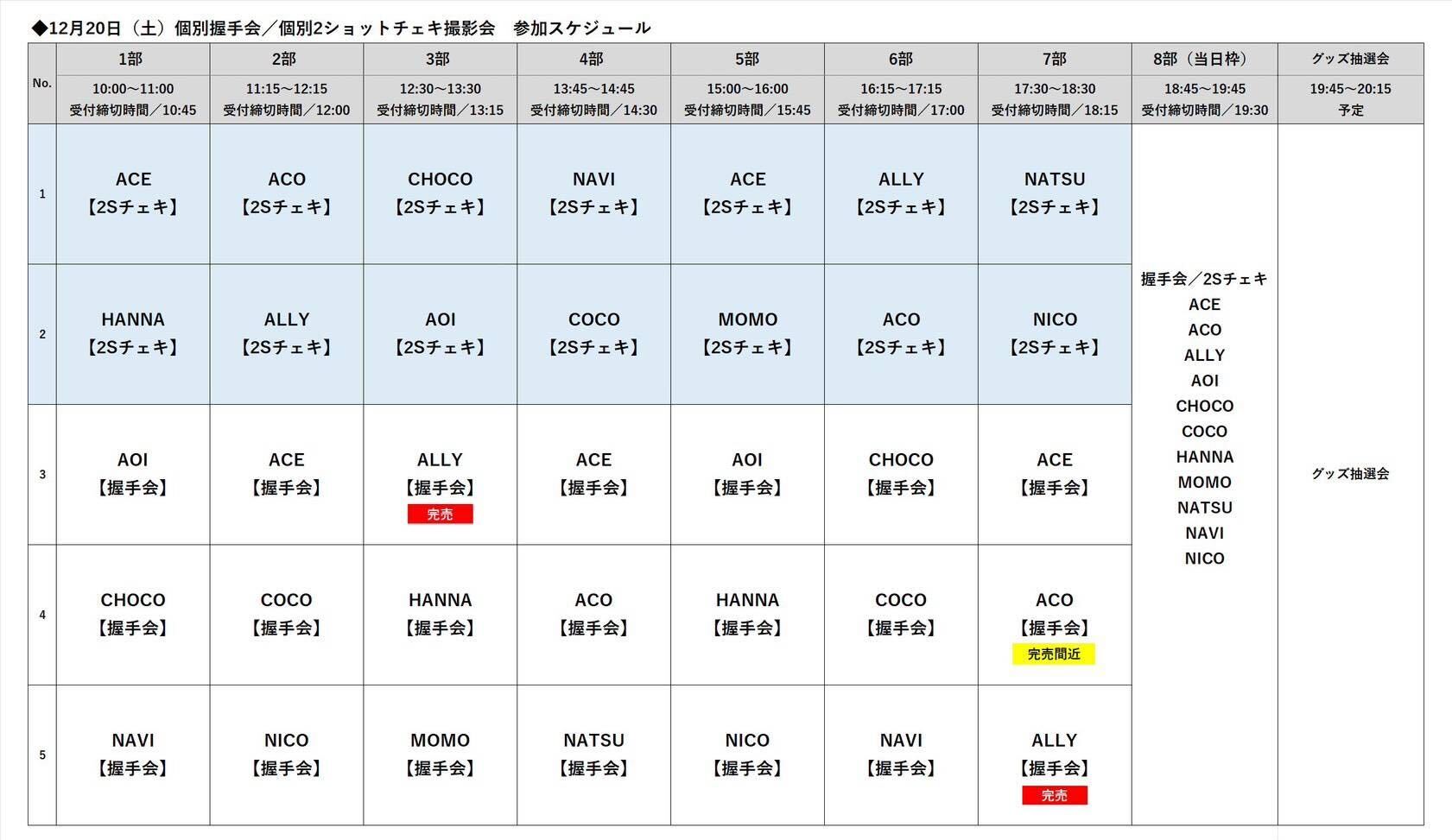 ・抽選会は握手会/2ショットチェキ撮影会の全工程終了後に実施いたします。実施時間は19:45~20:15(抽選締切19:45)を予定しております。