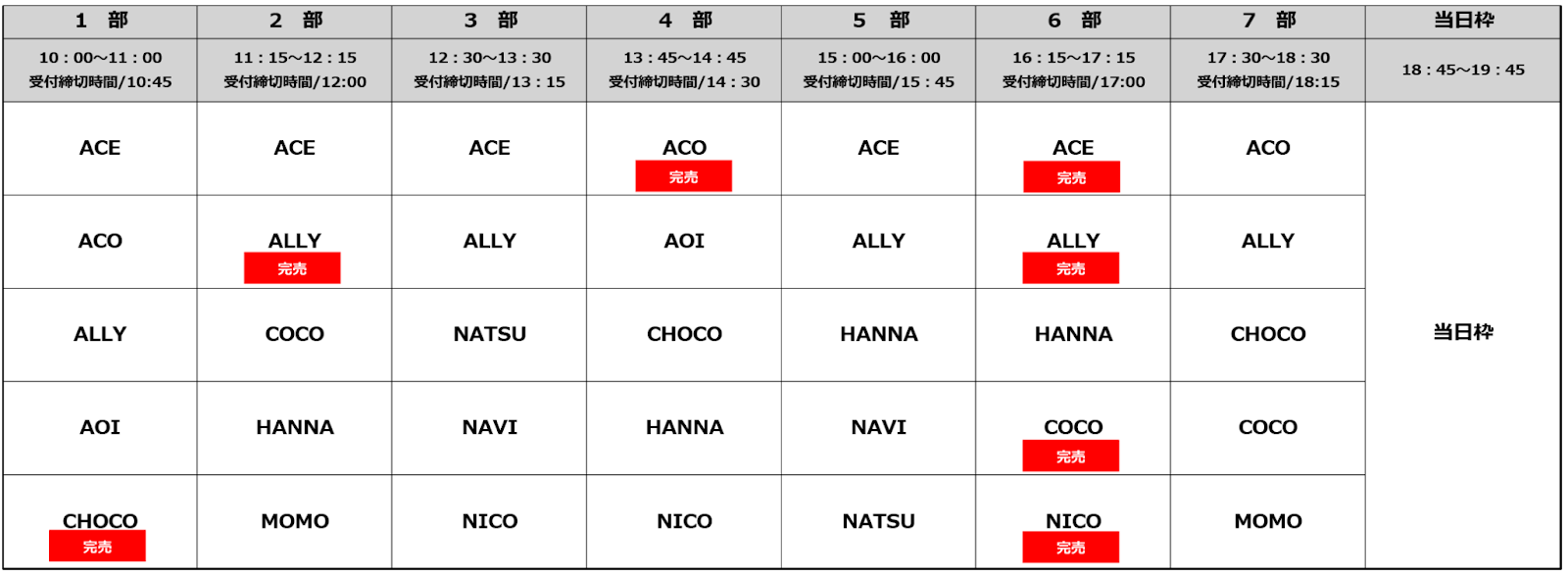 ACE / ACO / ALLY / AOI / CHOCO / COCO / HANNA / MOMO / NATSU / NAVI / NICO