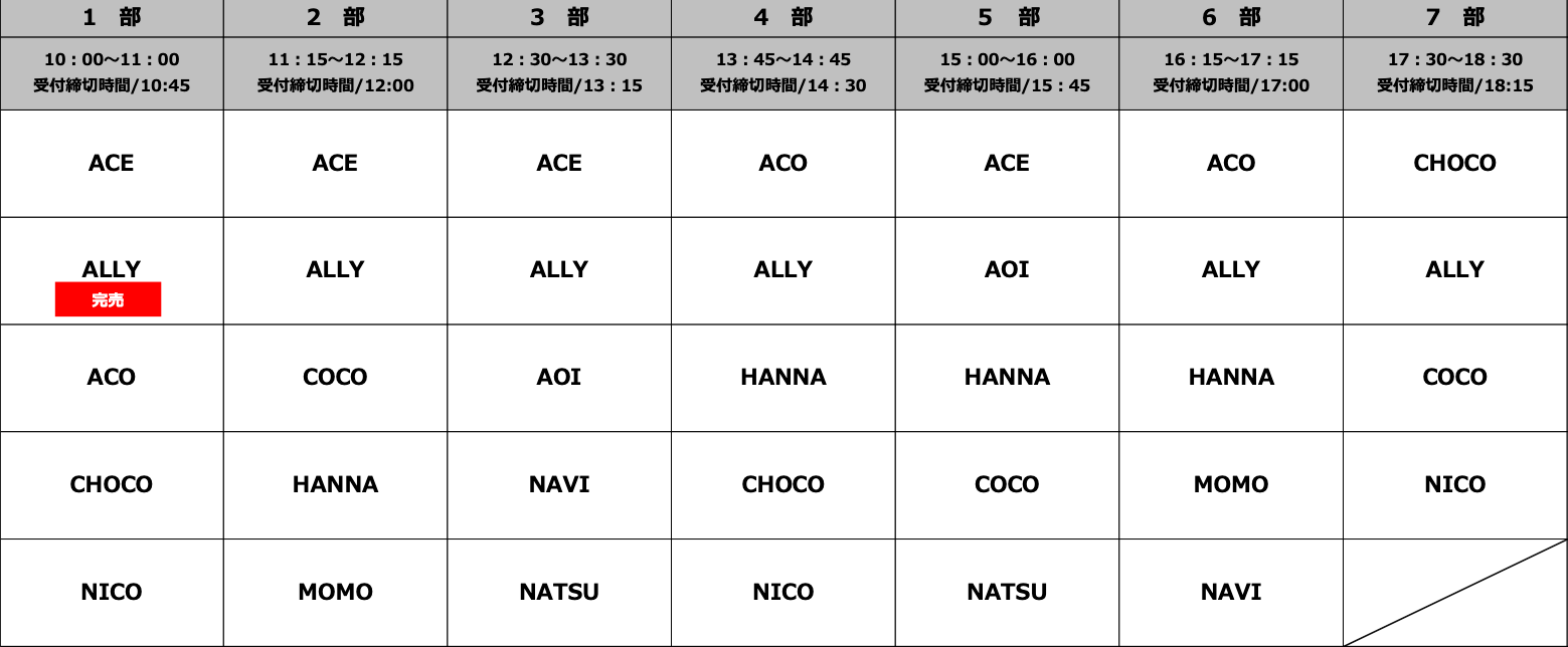 ACE / ACO / ALLY / AOI / CHOCO / COCO / HANNA / MOMO / NATSU / NAVI / NICO