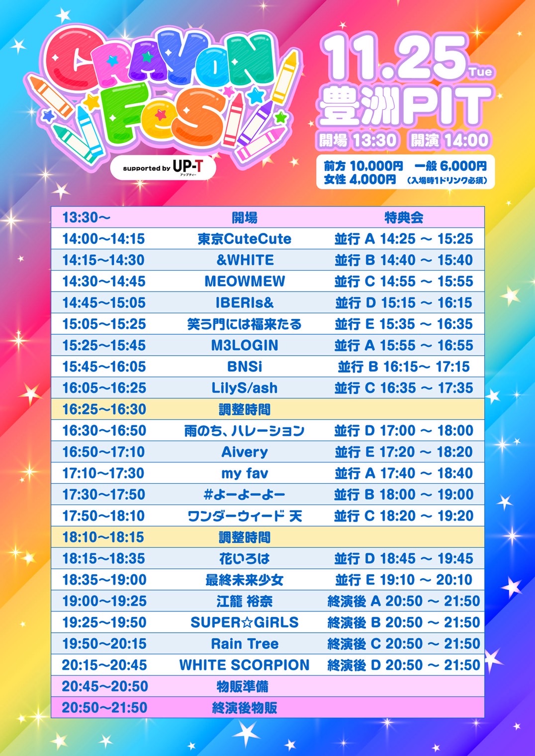 2025.11.25.TUE 「CRAYON Fes supported by UP-T」 LIVE/EVENT 11月25日(火)開催「CRAYON Fes supported by UP-T」にWHITE SCORPION の出演が決定しました!詳細は追ってお知らせいたします。 日程:2025年11月25日(火)会場:豊洲PIT開場:13:00開演:13:30※変更の可能性がございます。出演時間:20:15〜20:45特典会:D 20:50〜21:50 料金:前方 10,000円 /一般 6,000円 /女性 4,000円(入場時1ドリンク必須) BACK INDEX NEXT